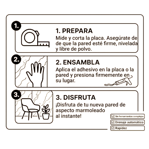 La facilidad de instalación es una de las grandes ventajas de nuestro producto. Hemos eliminado la necesidad de herramientas complejas o de conocimientos especializados en construcción. Simplemente aplica el pegamento de alta calidad que incluimos en cada compra, y coloca las secciones de la placa sobre la superficie deseada. El proceso es tan sencillo que podrás transformar cualquier muro o pared de tu hogar u oficina en cuestión de minutos, disfrutando de un acabado profesional y duradero sin esfuerzo ni estrés.